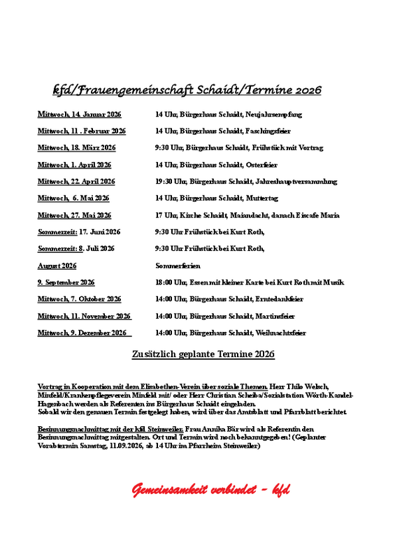 Die kfd Schaidt trifft sich 1x im Monat ab 14 Uhr im Bürgerhaus Schaidt zu ihren Treffen mit einem kleinen Programm und Kaffee/Kuchen/Herzhaftes oder zum Frühstück (gesonderte Einladung im Sommer). Die Termine werden im Pfarrblatt oder in den Medien veröffentlicht.