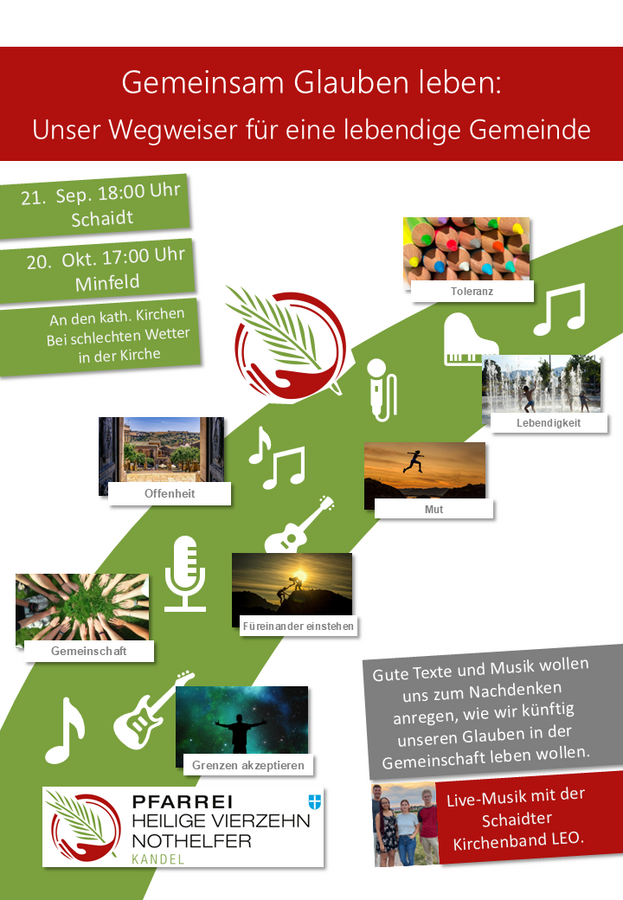 20.09. und 20.10. Open-Air-Veranstaltungen zur Vorstellung des Konzepts mit Musik, Imbiss und Austausch. Einladung an alle, die sich über die Neuausrichtung, wie wir Kirche in unserer Pfarrei sein möchten, informieren wollen.