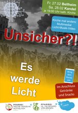 Der vierte Gottesdienst der Reihe "Es werde Licht" ist eine Kooperation der kath. Pfarrei Kandel, der kath. Pfarrei Bellheim und der Jugendkirche "Lumen" der Diözese Speyer. Er findet statt am Freitag, den 27. Februar um 19 Uhr in der kath. Kirche in Bellheim und am Samstag, den 28.2. um 19 Uhr in der kath. Kirche in Kandel. Im Anschluss besteht die die Möglichkeit, bei einem kleinen Imbiss und Getränken den Abend gemeinsam ausklingen zu lassen. (Matthias Peck)