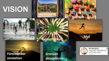 Wir Christen der Pfarrei Heilige Vierzehn Nothelfer (vertreten durch die Pfarrgremien) haben uns mit dieser Vision eine Orientierung gegeben, auf welche Art und Weise wir künftig Kirche sein möchten. Damit wollen wir unserem Auftrag in der Kirche und in der Welt gerecht werden.
