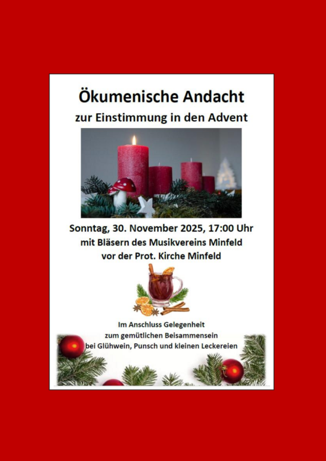 Am Sonntag, den 30. November laden wir die ganze Bevölkerung um 17:00 Uhr in die prot. Kirche in Minfeld ein. Dort findet eine ökumenische Andacht mit Unterstützung der Bläser des Musikvereins Minfeld statt. Im Anschluss ist die Gelegenheit zum gemütlichen Beisammensein bei Glühwein, Punsch und kleinen Leckereien.