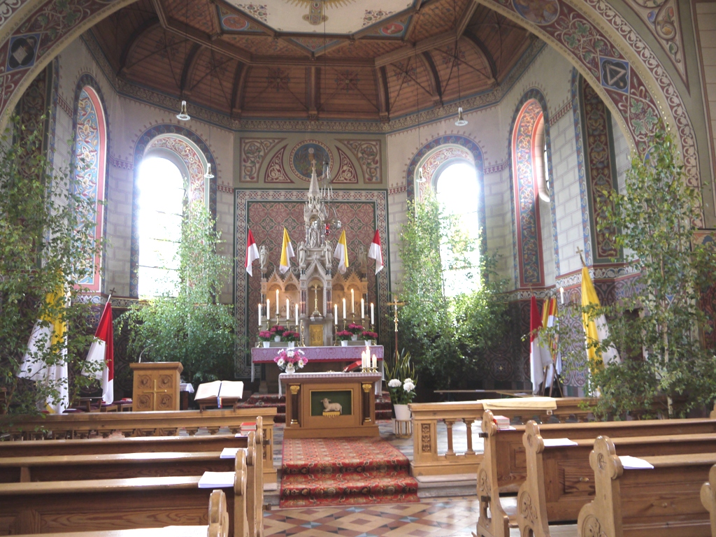 Weitere Zierden sind verschiedene Heiligenfiguren an den Wänden, zwei Seitenaltäre (Maria und Josef gewidmet) sowie die hölzerne Kanzel, der Hochaltar und der Taufstein. Die Orgel stammt aus dem Jahr 1898.
